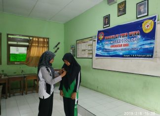 Prosesi pemasangan Pin calon anggota PMR Wira angkatan XXVI SMAN 1 Dolopo